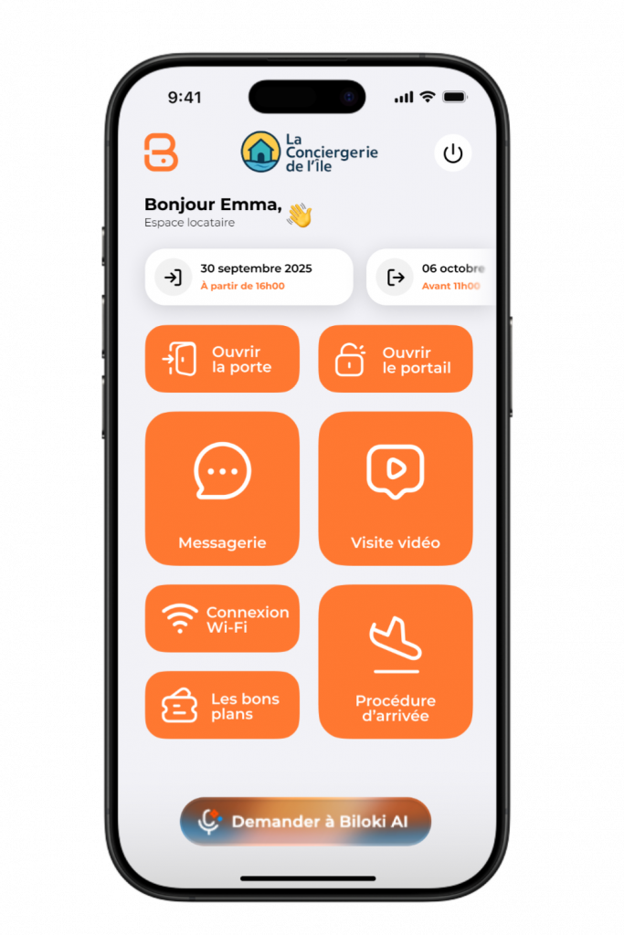 Interface Locataire Accédez en un geste Ouvrez la porte et le portail, sans clés ni contraintes. Visite autonome Un mosaïque vidéo immersive pour découvrir chaque pièce du logement. Discutez en direct Un chat intégré pour rester connecté à votre conciergerie. Connectez-vous Le Wi-Fi du logement, accessible en un clic. Vivez l'expérience locale Retrouvez les meilleurs bons plans sélectionnés pour vous. Demandez à Biloki AI Votre assistant intelligent disponible 24/7, pour répondre à toutes vos questions. Découvrez quelques exemples en vidéo Je planifie une démo De l'aéroport à la location plus qu'un simple GPS, Biloki guide votre locataire jusqu'au derniers mètres de son logement L'ouverture de la porte Biloki donne au locataire les consignes et les codes pour accéder à la propriété en toute sérénité