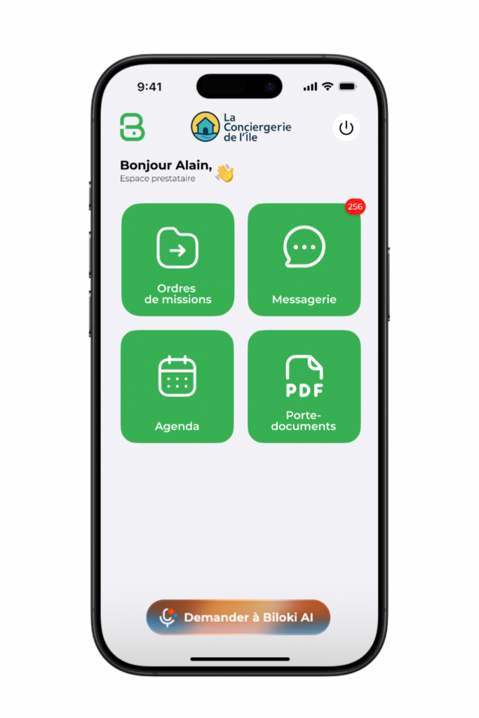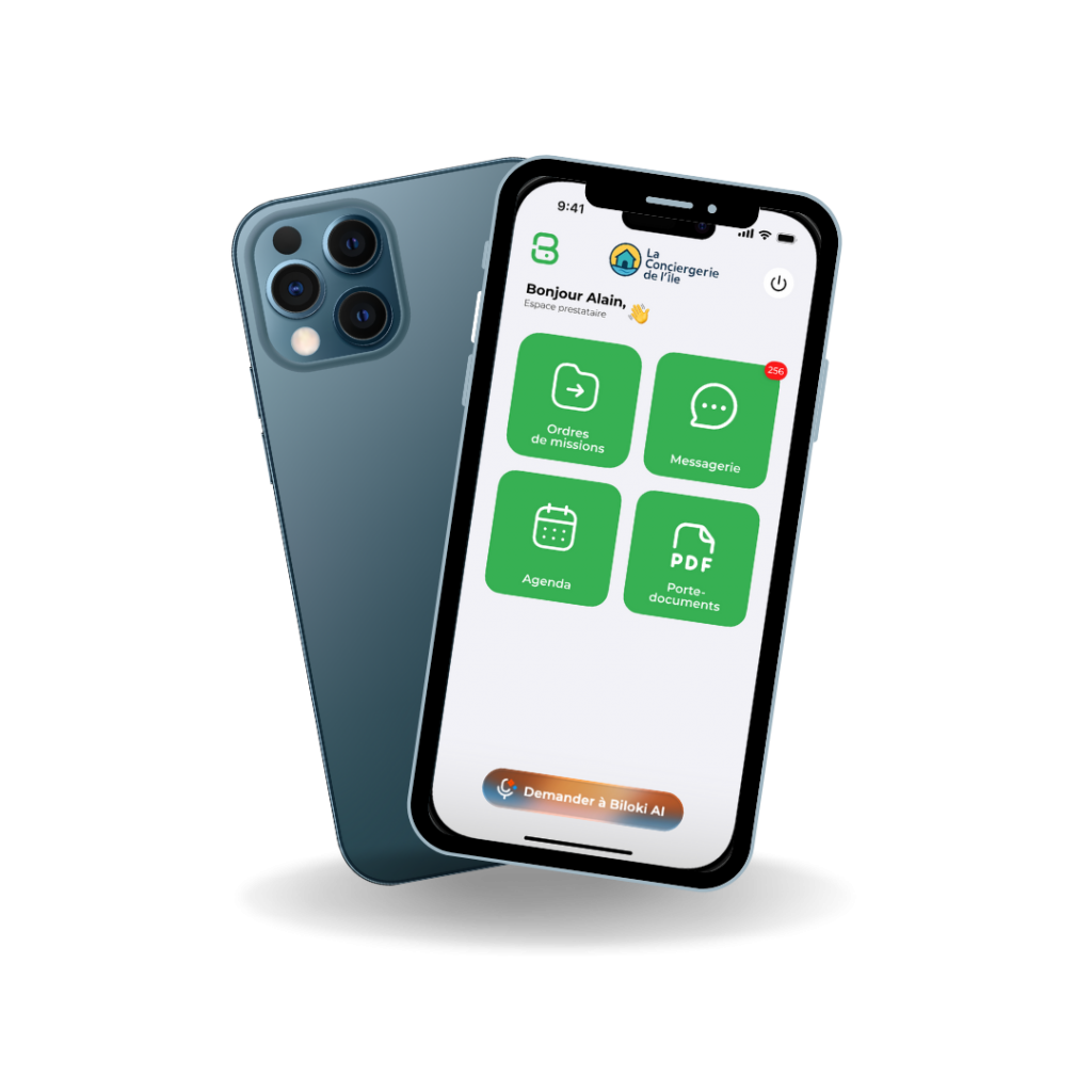 Interface prestataire Missions claires. Zéro perte de temps Chaque intervention expliquée, checklist incluse. Un canal unique Discutez directement avec la conciergerie, sans appels inutiles. Agenda intelligent Vos rendez-vous organisés et optimisés, toujours à jour. Tous vos documents en poche Contrats, factures, rapports : accessibles en un clic. Biloki AI, votre assistant métier Des réponses rapides et des conseils pratiques, où que vous soyez. Découvrez quelques exemples en vidéo Je planifie une démo Les prochaines missions Une vision sur votre planning en temps réel !