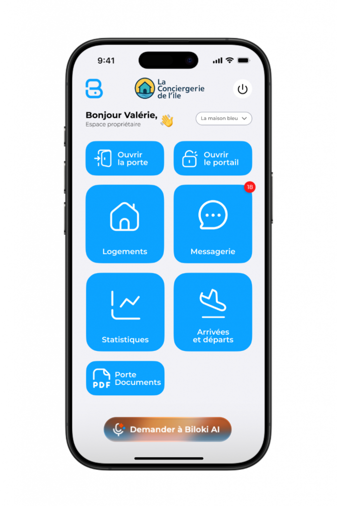 Interface propriétaire Accès en toute liberté Ouvrez votre porte et portail, où que vous soyez. Vos biens, sous contrôle Un tableau de bord clair pour piloter chaque logement. Communication simplifiée Discutez directement avec votre conciergerie. Des chiffres qui comptent Suivez votre taux de réservation et vos indicateurs clés en temps réel. Suivi des séjours Arrivées et départs gérés en toute transparence. Tous vos documents réunis Factures, contrats et rapports accessibles en un clic. Biloki AI, votre conseiller Un assistant intelligent qui vous guide et valorise vos investissements. Découvrez quelques exemples en vidéo Je planifie une démo Les statistiques Les performances de vos biens Mes réservations Une vision sur les réservations en temps réel